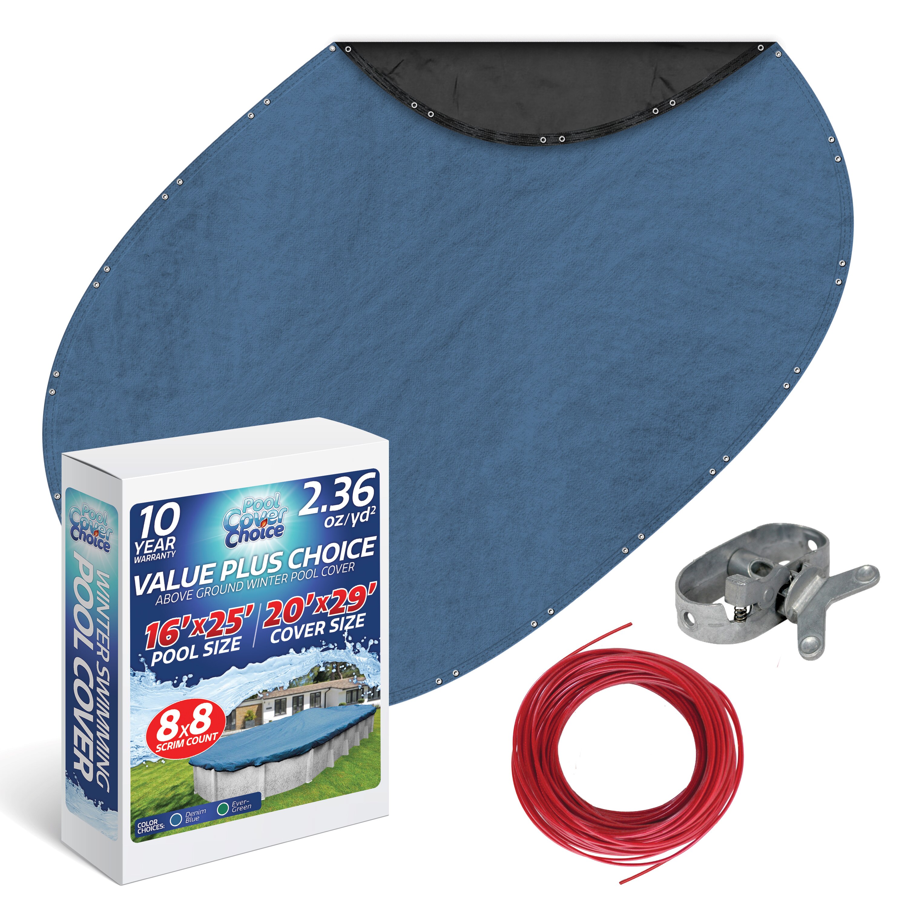 Protect your above ground swimming pool with the Pool Cover Choice Value Plus Choice solid winter pool cover. The polyethylene material, which does not allow water to pass through, is constructed with a 8x8 scrim (threads per square inch). Covers with a higher scrim will have a better overall quality, strength, and durability. The material weighs 2.36 ounces per square yard which is important because heavier covers will be affected less by extreme elements. The topside of this cover has been treated to inhibit UV rays and the bottom of the cover is black to help prevent algae growth. This cover has an additional four foot overlap to ensure complete coverage of pools with top rails of up to nine inches. Two aluminum grommets, four inches apart, are placed every four feet around the perimeter of the cover and two lines of double chain stitching secure the hem. The included plastic coated cable and locking ratchet tightens the cover securely around the pool. The Pool Cover Choice Value Plus Choice comes in multiple colors (depending on pool size and availability) and is covered by a ten-year warranty.Warning: The cable included in this product can expose you to Di(2-ethylhexyl)phthalate (DEHP), a chemical which is known to the State of California to cause cancer, birth defects or other reproductive harm. For more information go to www.P65Warnings.ca.govThe winch included in this product can expose you to lead, a chemical which is known to the State of California to cause cancer, birth defects or other reproductive harm. For more information go to www.P65Warnings.ca.gov