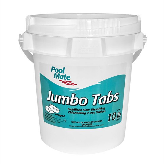Pool Mate 3" Jumbo Tabs are the strongest chlorine tablets available. Each 3" 8 oz. tab is individually wrapped, stabilized, and slow dissolving. The tabs are wrapped to make handling safer and easier. These chlorine tabs are stabilized to protect against harmful UV rays. This will improve the chlorine residual in your pool. Customers prefer Pool Mate Jumbo Tabs because it is the longest lasting chlorine available. The initial startup and weekly maintenance dosage is 1 to 3 tablets per 10,000 gallons, although this dosage may vary due to unusual conditions such as heavy bather loads, wind, heavy rains, and high temperature. Adjust the rate of the floater or in-line feeder to provide 2.0-4.0 ppm of free chlorine residual. Maintain pH at 7.4-7.6 and total alkalinity at 80-130 ppm.
