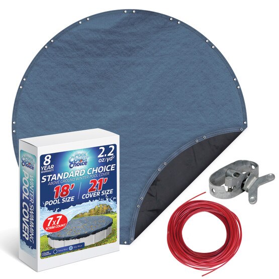 Protect your above ground swimming pool with the Pool Cover Choice Standard Choice solid winter pool cover. The polyethylene material, which does not allow water to pass through, is constructed with a 7x7 scrim (threads per square inch). Covers with a higher scrim will have a better overall quality, strength, and durability. The material weighs 2.2 ounces per square yard which is important because heavier covers will be affected less by extreme elements. The topside of this cover has been treated to inhibit UV rays and the bottom of the cover is black to help prevent algae growth. This cover has an additional three foot overlap to ensure complete coverage of pools with top rails of up to six inches. Two aluminum grommets, four inches apart, are placed every four feet around the perimeter of the cover and two lines of double chain stitching secure the hem. The included plastic coated cable and locking ratchet tightens the cover securely around the pool. The Pool Cover Choice Standard Choice comes in multiple colors (depending on pool size and availability) and is covered by an eight-year warranty.