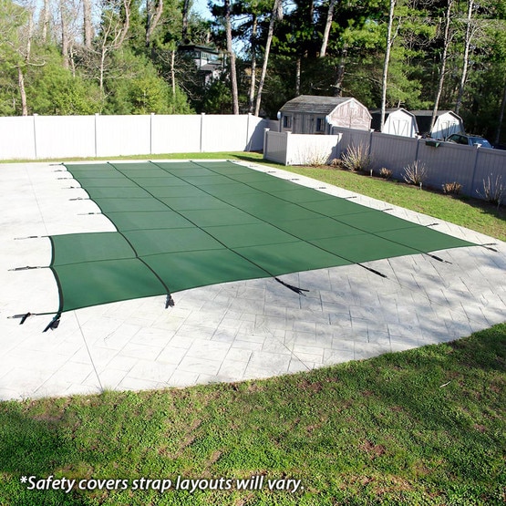 Yard Guard safety covers are manufactured with the highest standards in the industry and are designed to keep your pool safe and clean. This cover is reinforced with heavy-duty webbing along the top and bottom of every seam. Unlike other safety covers, which feature webbing on only one side of the cover, Yard Guard's webbing on both sides increases the strength of the cover by double. Rub strips are placed where the strapping would go over the coping to prevent wear and tear. Marine-grade white triple line stitching is used to secure all straps with cross and box tack at all perimeter stress points. The Yard Guard BLOC Mesh 99% safety cover features a 99% shade rated, heavy-duty, porous mesh. Shade rating is the percentage of sunlight the cover blocks from entering your pool. The more sunlight that is blocked by the cover, the less algae that will be able to grow in your pool. This mesh also features a 58 x 48 scrim count (threads per square inch), which is a measure of how tightly woven the material is. The material used is also 7.1 oz/yd2 and 18 mills thick. All Yard Guard covers are manufactured using the most modern equipment, including a computerized cutting and shaping system. All covers, throughout every stage of production, are quality checked and signed for before final packaging. The hardware included with this cover is prepackaged in individual poly bags, each containing a brass plug, brass screw, spring, buckle, and vinyl sleeve.