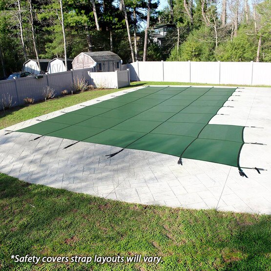 The Yard Guard Aquamaster is a lightweight solid safety cover that is up to 50% lighter than conventional vinyl solid covers but is also up to 70% stronger. This tough, non-porous material blocks sunlight and helps prohibit algae growth, plus the durable coating will not fade or stain. Safety covers are a premium option for swimming pool owners who are looking for a great looking product that will keep unwanted intruders from entering their swimming pool. Yard Guard safety covers are manufactured with the highest standards in the industry and are designed to keep your pool safe and clean. This cover is reinforced with extra heavy-duty webbing along the top and bottom of every seam. Unlike other safety covers, which feature webbing on only one side of the cover, Yard Guard's webbing on both sides increases the strength of the cover by double. Rub strips are placed where the strapping would go over the coping to prevent wear and tear. Marine-grade heavy-duty white triple line stitching is used to secure all straps with cross and box tack at all perimeter stress points. All Yard Guard covers are manufactured using the most modern equipment, including a computerized cutting and shaping system. All covers, throughout every stage of production, are quality checked and signed for before(more...)