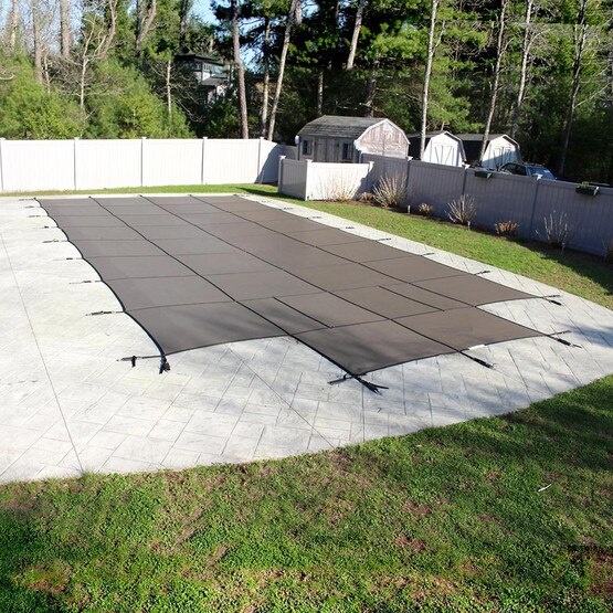 Yard Guard safety covers are manufactured with the highest standards in the industry and are designed to keep your pool safe and clean. This cover is reinforced with heavy-duty webbing along the top and bottom of every seam. Unlike other safety covers, which feature webbing on only one side of the cover, Yard Guard's webbing on both sides increases the strength of the cover by double. Rub strips are placed where the strapping would go over the coping to prevent wear and tear. Marine-grade white triple line stitching is used to secure all straps with cross and box tack at all perimeter stress points. The Yard Guard Standard Mesh safety cover features a 90% shade rated, heavy-duty, porous mesh. Shade rating is the percentage of sunlight the cover blocks from entering your pool. The more sunlight that is blocked by the cover, the less algae that will be able to grow in your pool. This mesh also features a 34 x 20 scrim count (threads per square inch), which is a measure of how tightly woven the material is. The material used is also 4.2 oz/yd2 and 12 mills thick. All Yard Guard covers are manufactured using the most modern equipment, including a computerized cutting and shaping system. All covers, throughout every stage of production, are quality checked and signed for before final packaging. The hardware included with this cover is prepackaged in individual poly bags, each containing a brass plug, brass screw, spring, buckle, and vinyl sleeve.