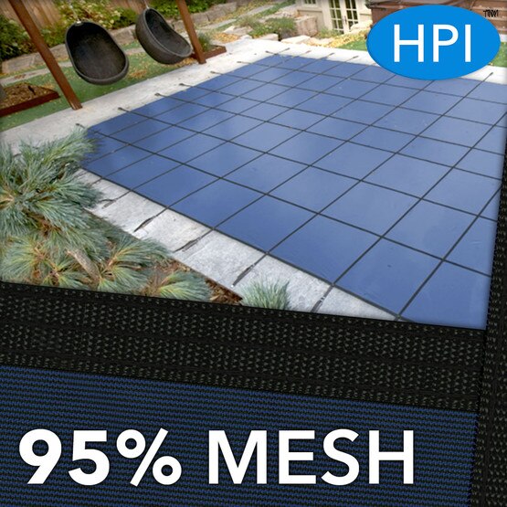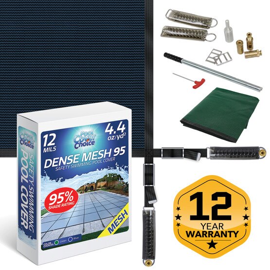 Protect your pool and your family with the Pool Cover Choice Dense Mesh 95. Manufactured in USA and Canada, this is a top-of-the-line safety winter pool cover that acts as a barrier to keep debris out of the water and people and pets out of the pool. Heavy-duty webbing sewn to both sides of the material disperse weight and stress, giving the strength it needs to be ASTM rated as a safety cover. At the end of each strap, a stainless steel spring hooks to brass anchors set into the pool's deck, securing the cover in place. Around the perimeter of the cover, under each strap, rubber rub-strips protect the strap from abrasion the would otherwise be caused by the pool's deck and coping. Marine-grade, UV protected, triple line stitching is used to secure all straps with cross and box tack at all perimeter stress points for added toughness.